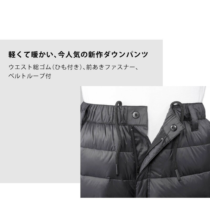 商品情報素材/材質表地:ナイロン100%裏地:ポリエステル100%詰物:ダウン90%、フェザー10%サイズ/寸法【M】適応ウエスト:76〜84ヒップ:108総 丈:99股 上:28股 下:71裾 幅:22【L】適応ウエスト:84〜94ヒップ:112総 丈:102股 上:29股 下:73裾 幅:22.5【LL】適応ウエスト:94〜104ヒップ:116総 丈:105股 上:30股 下:75裾 幅:23仕様左右ポケット2、右後ろポケット1ウエスト総ゴム(ひも付き)、前あきファスナー、ベルトループ付、裾にドローコード付、収納袋付き説明軽くて暖かい、今人気の新作ダウンパンツです。