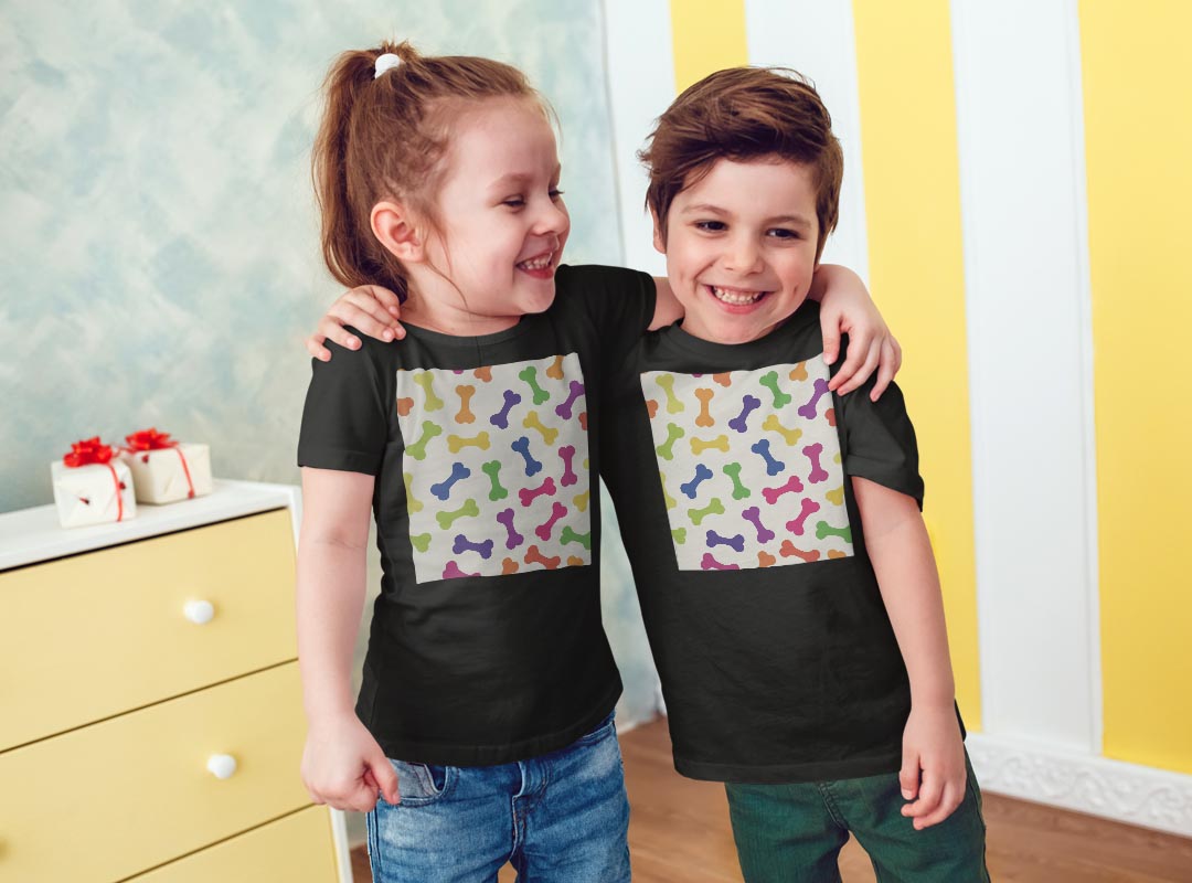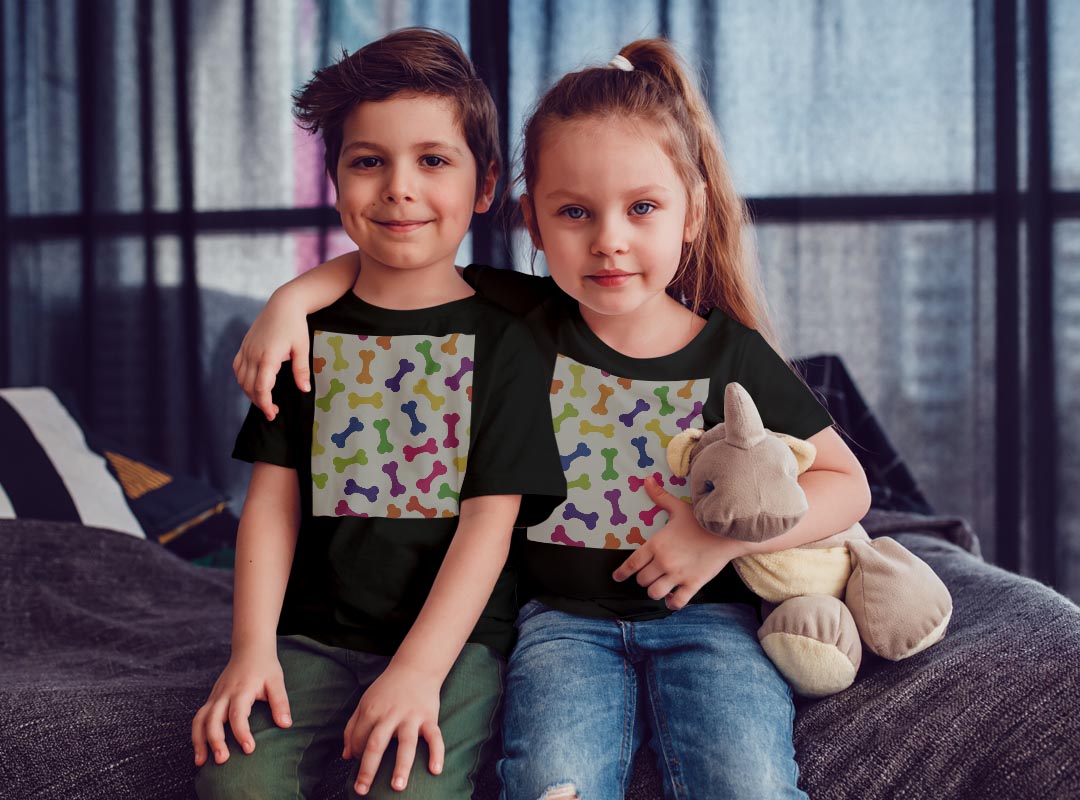 tシャツ キッズ 半袖 黒地 ブラック デザイン 90 100 110 120 130 140 150 Tシャツ ティーシャツ T shirt 008123 犬 カラフル 骨 模様
