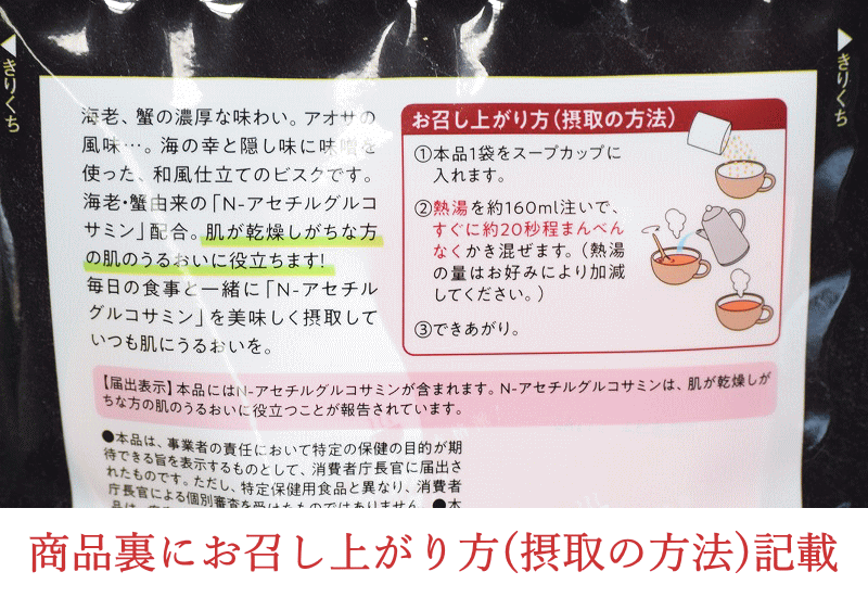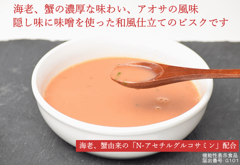 栄養成分表示(1袋13.4gあたり) エネルギ—:52Kcal たんぱく質:1.2g 脂質:1.8g 炭水化物:7.7g 食塩相当量 :2.3g 機能性関与成分 N-アセチルグルコサミン 500mg 商品検索対象 ビスク 海老と蟹のビスク 乾燥スープ 機能性表示食品 N-アセチルグルコサミン ポタージュ お花見 母の日 父の日 お中元 お歳暮 ギフト ビスク(bisque)とは フランス発祥の、主に海老、蟹などの甲殻類を裏ごししたソースを使用した、クリームベースのスープです。