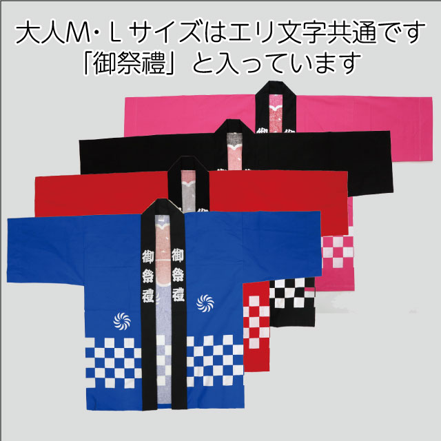 [メール便送料無料]祭り半纏 大人 Lサイズ 身丈87cm 身幅72cm 市松柄 青 赤 黒 ピンク 帯・ハチマキ付(国産 日本製 祭り 祭 半纏 半天 はんてん 法被 半被 はっぴ 祭り衣装)