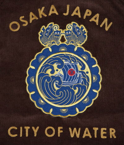 インディゴ染めコーデュロイ生地、硫化ブラウン染めコーデュロイ生地、オリジナルワッペン/刺繍、ユニバーサルファスナー、樹脂ボタン、サムライ倶楽部ネーム、日本製。