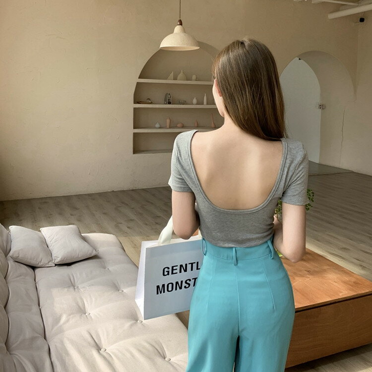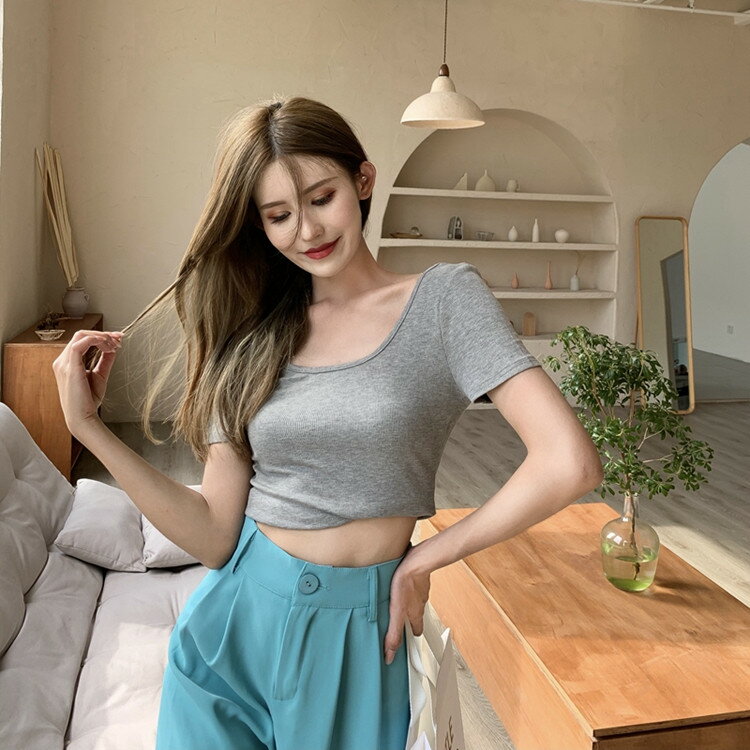 女の子ファッション 夏 タイト半袖トップス ビッグUネックショートTシャツ 【素材】ポリエステル コットンカラー:ホワイト,ライトブルー,ピンク,ミントグリーン,グレー,ブラックサイズ: 着丈:約39cm 袖丈:約16cm 肩幅:約34cm バスト:約64-160cm ※サイズについては2-3センチの誤差があります。